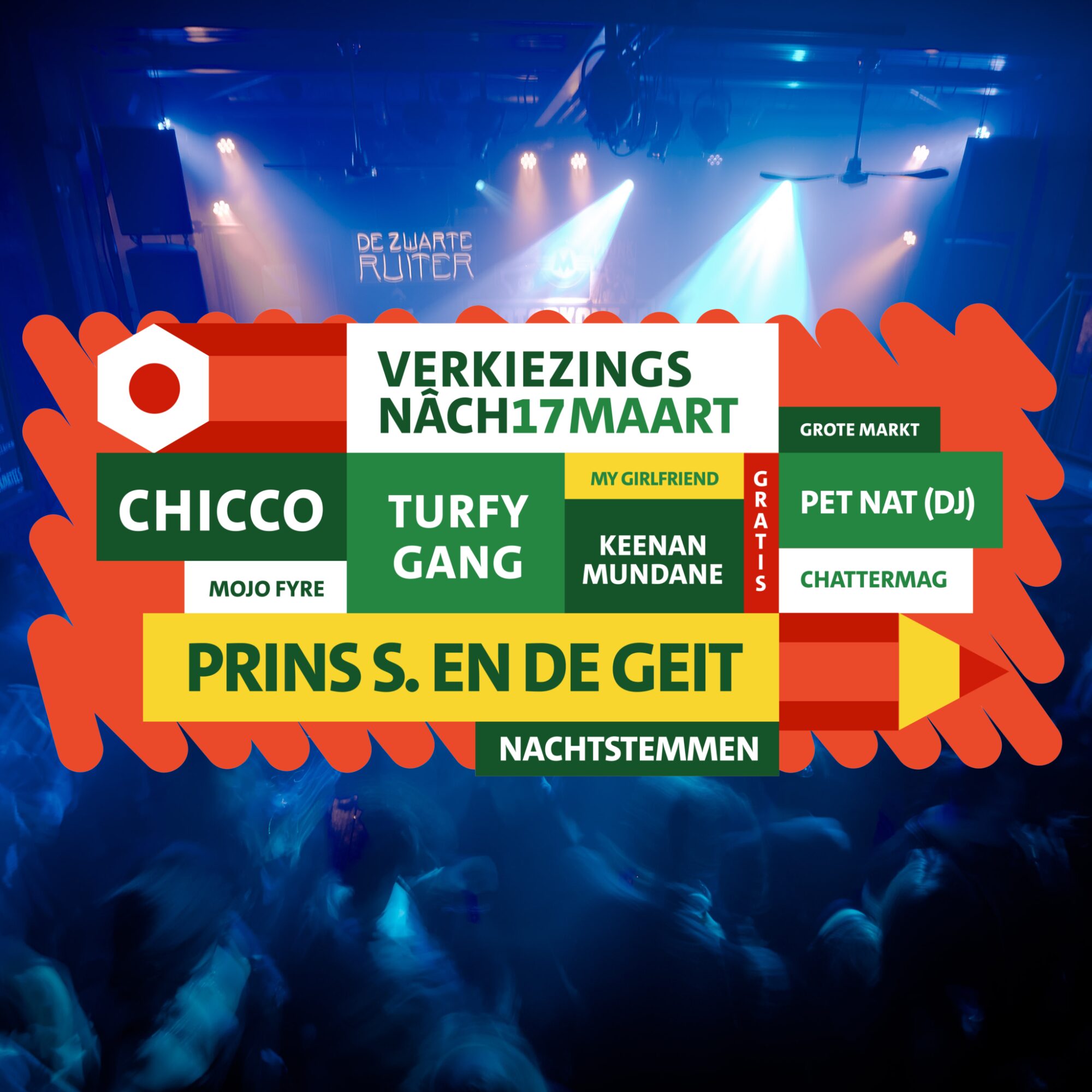 Altijd gratis entree. Al 30 jaar zie je elk weekend in de Zwarte Ruiter bands de borsten uit hun houder en de ballen uit hun broek spelen. Van Wodan Boys tot Prins S. en De Geit, van Stake tot The Opposites. De podiumplanken zijn verzadigd van het zweet van Haagse bands als Di-Rect, The Deaf en Son Mieux, die in de Ruiter hun eerste shows gaven.